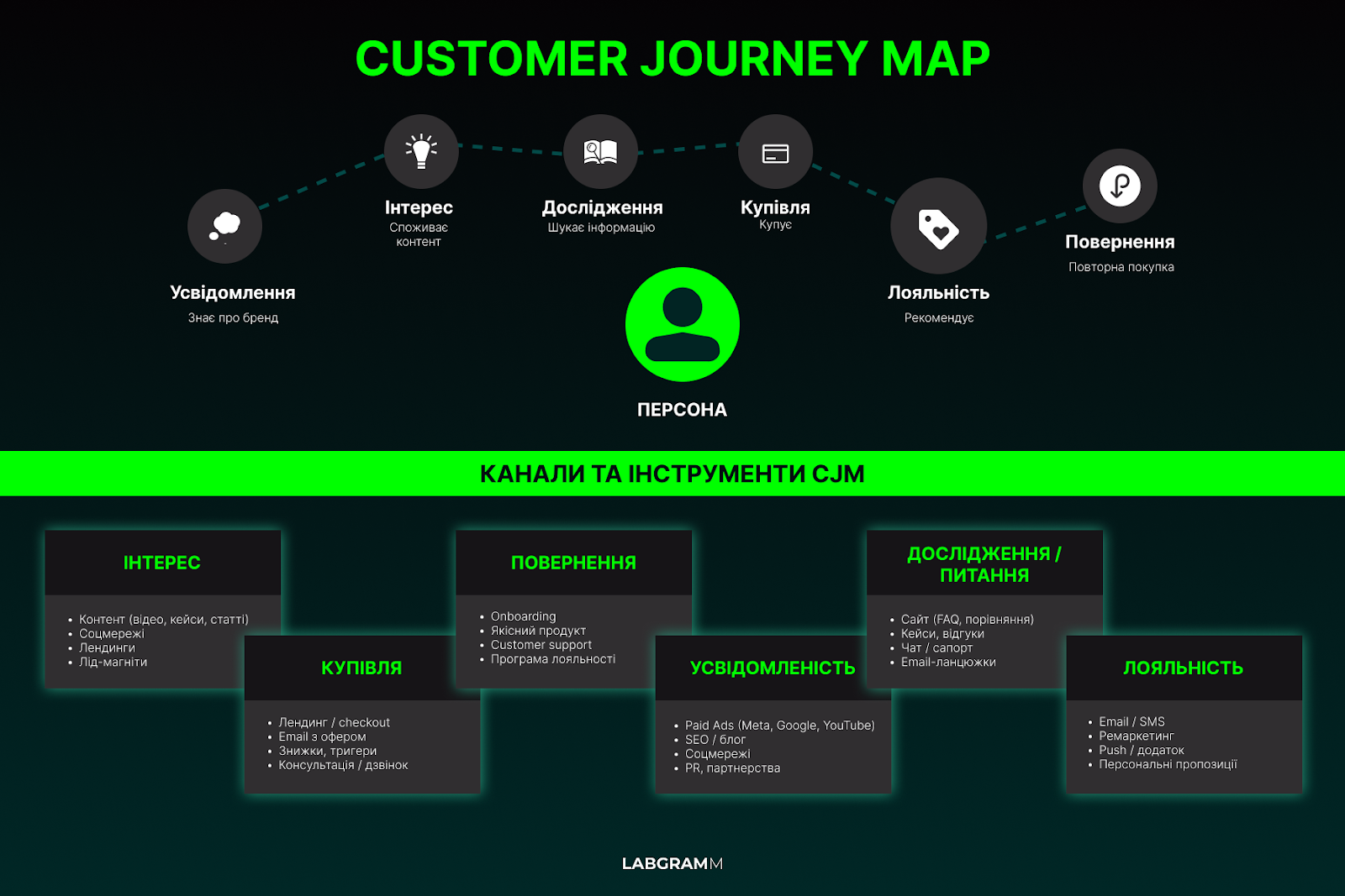 - Точки контакту (touchpoints) — усі канали взаємодії;